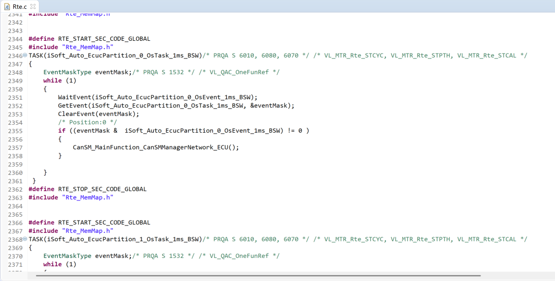 The OS tasks executed in the project is located in Rte.c file under the path of Demo_TC397_V2510_HighTec_V4941_Project \BSW\Config\BSW_Config\RTE. Users can add the functions they need to implement in relevant tasks.