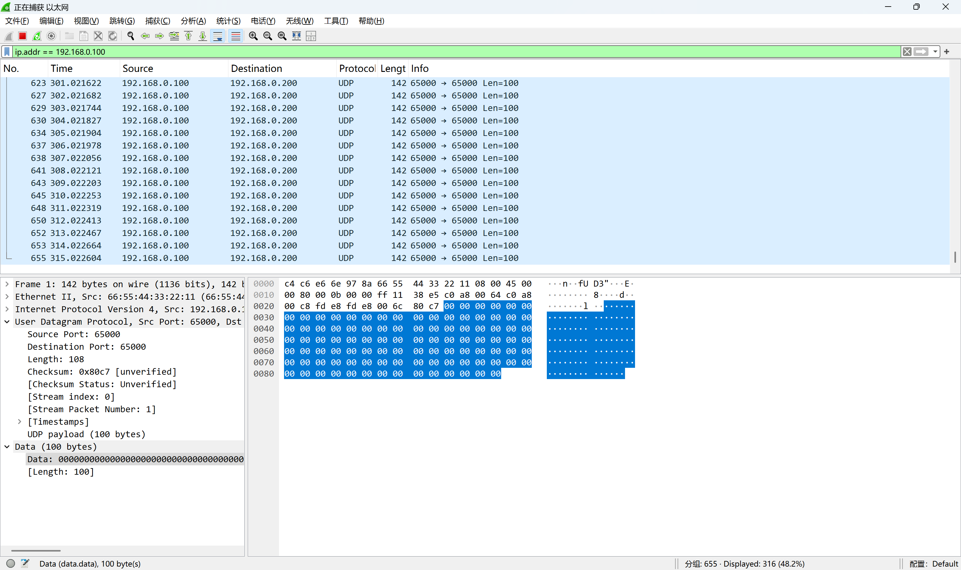 正确连接开发板并成功下载运行后,使用通信测试验证工具接收板子发出的报文,可以收到如下报文。