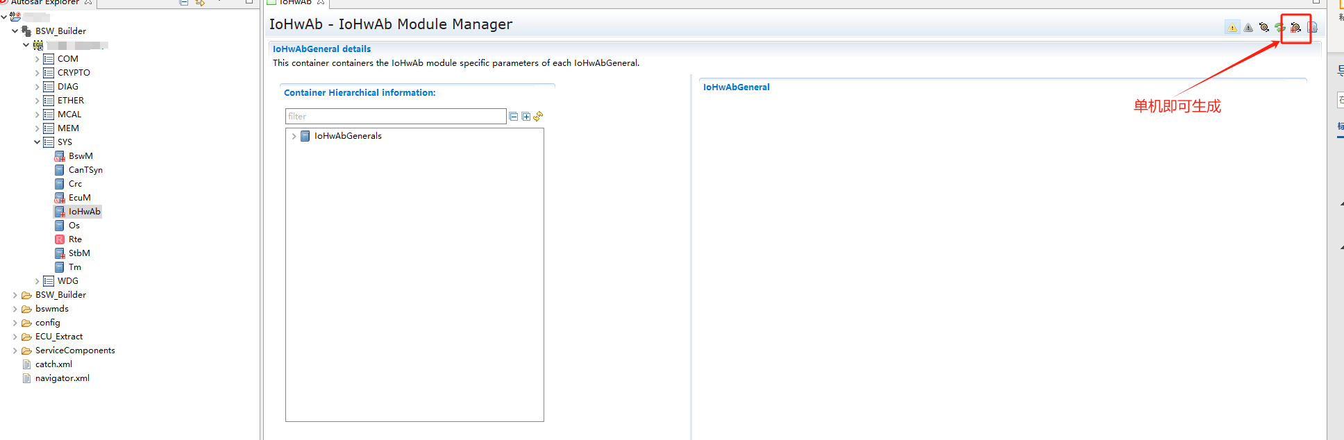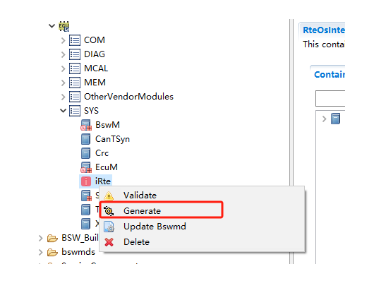 生成源代码,生成BSW所有模块的配置文件,生成顺序:其它BSW模块→iRTE→OS |