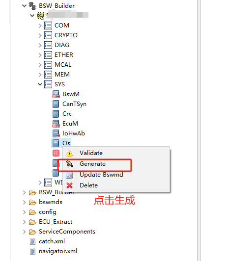 生成源代码,生成BSW所有模块的配置文件,生成顺序:其它BSW模块→RTE→OS |