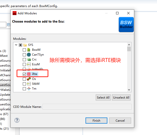 创建BSW工程,创建相关模块,使用iRTE模块 |