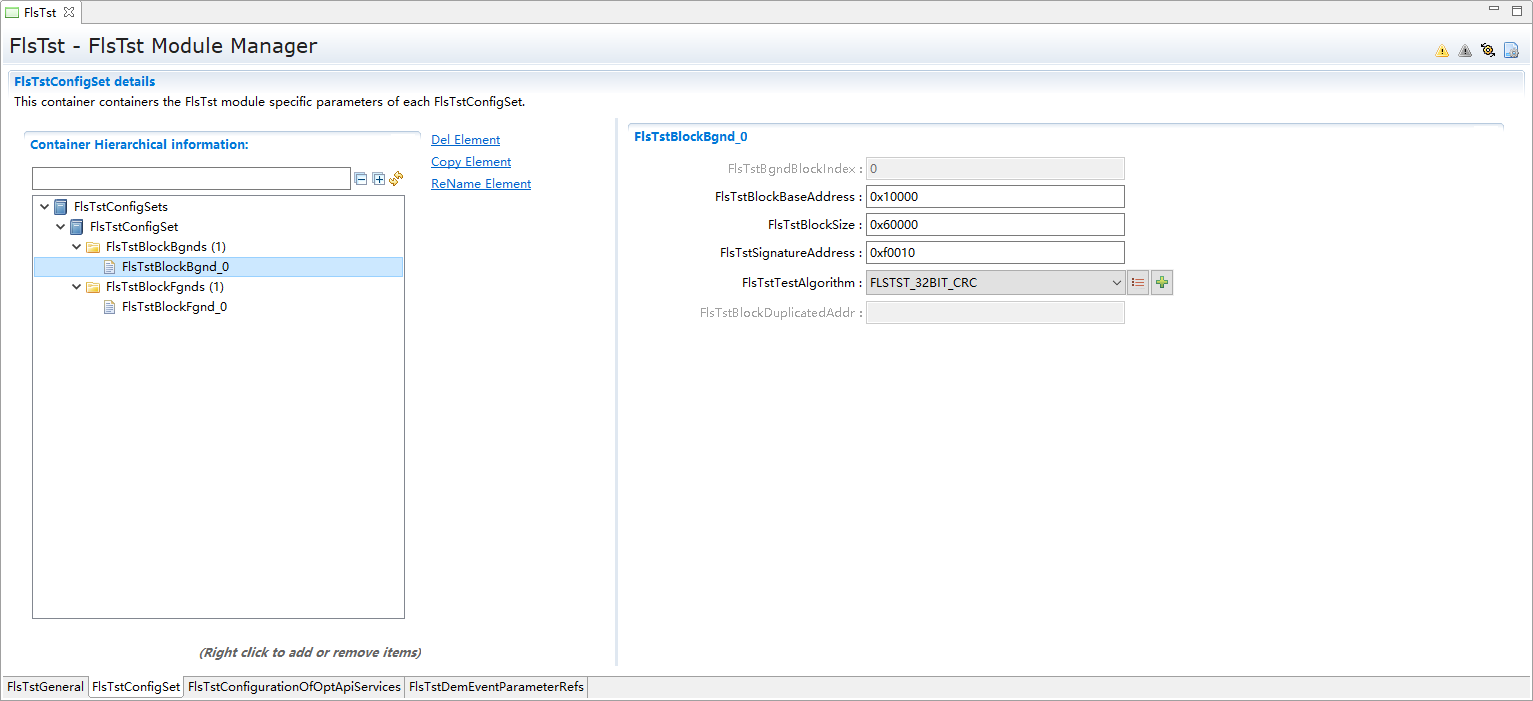 在FlsTstConfigSet->FlsTstConfigSet->FlsTstBlockBgnds,鼠标点击右键,添加新的Memory Block,添加待测的后台测试内存块,并根据配置参数表填写FlsTstBlockbaseAddress、lststBlockSize、FlsTstSignatureAddress的参数,并选择对应的FlsTstTestAlgorithm。