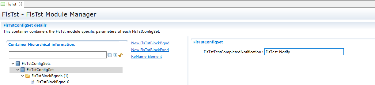 在FlsTstConfigSet->FlsTstConfigSet容器点击鼠标左键,对FlsTstTestCompletedNotification配置相应的回调函数。