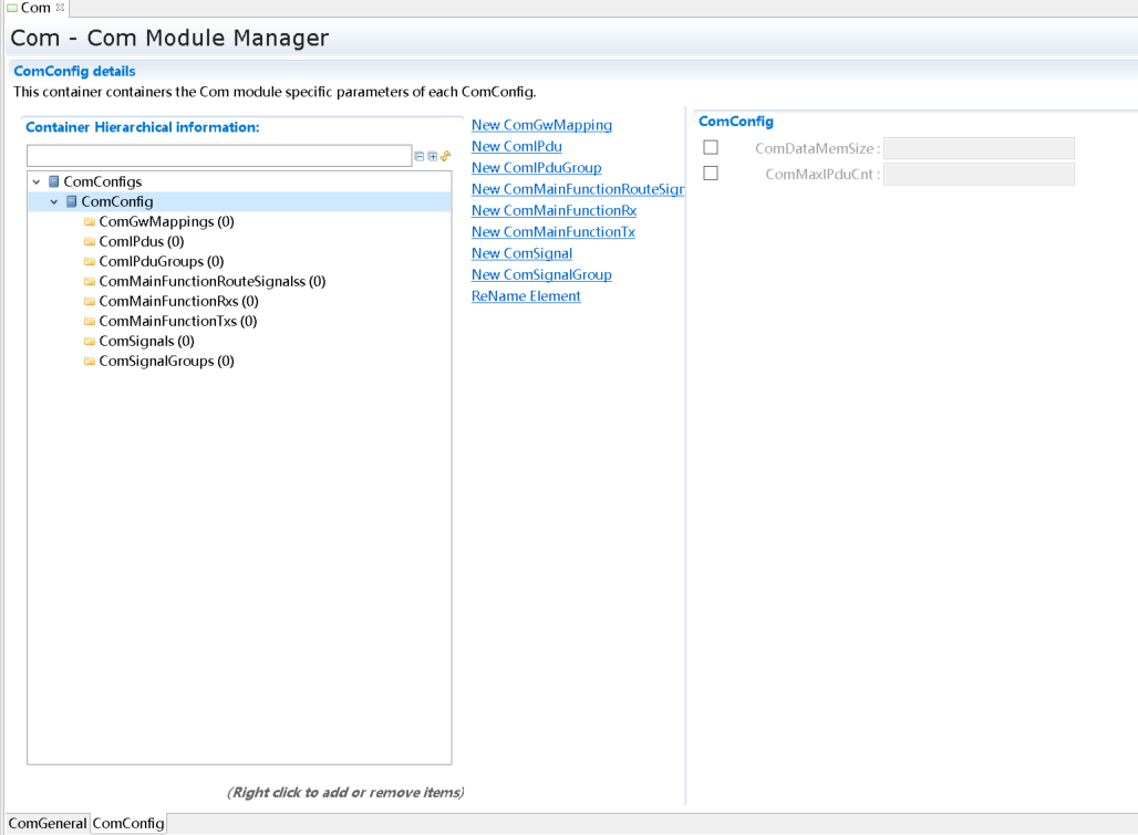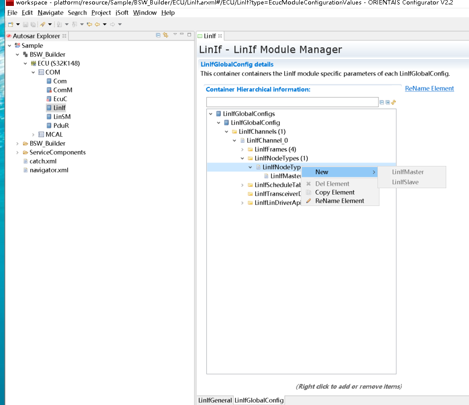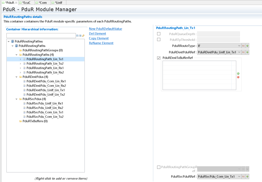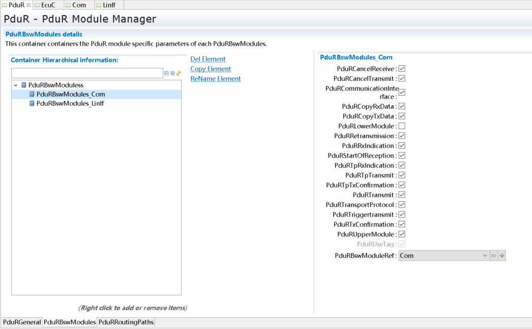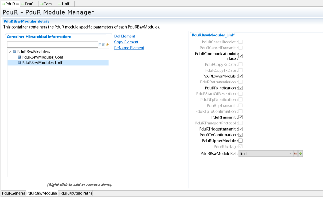 PduR模块的目的是实现上层模块到下层模块的路由。PduRBswModuler对象用来描述上层模块和下层模块属性。本示例中上层模块为Com,下层模块为LinIf,PduR模块将Com中的Pdu路由到LinIf中。所以需要新建2个PduRBswModuler对象,分别对应Com和LinIf。