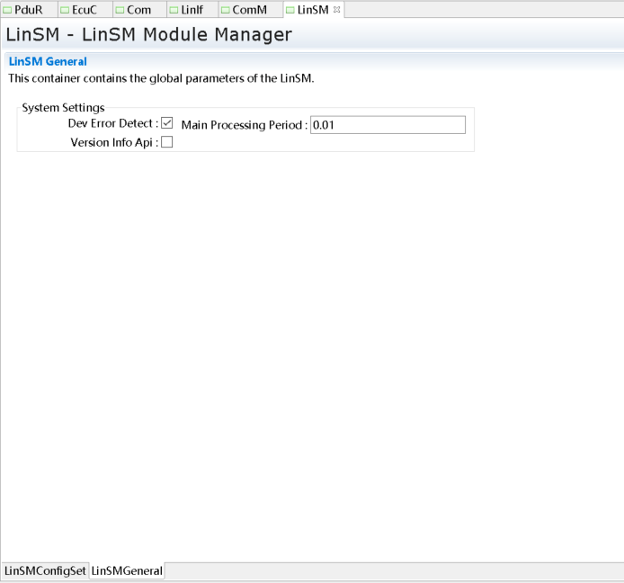 1// 初始化Lin、LinIf、LinSM模块 2Lin_Init(&Lin_Config); 3LinIf_Init(NULL_PTR); 4LinSM_Init(NULL_PTR); 5 6// 初始化PduR模块 7/* Initialize the Pdur module */ 8PduR_Init(&PduR_PBConfigData); 9 10// 初始化Com模块 11/* Initialize the Com module */ 12Com_Init(&Com_PBConfigData); 13// 使能接收和发送IPduGroup 14Com_SetIpduGroup(ipduGroupVector, Com_RxPduGroup_LinController_0, TRUE); 15Com_SetIpduGroup(ipduGroupVector, Com_TxPduGroup_LinController_0, TRUE); 16 17Com_ReceptionDMControl(ipduGroupVector); 18Com_IpduGroupControl(ipduGroupVector, TRUE); 19 20// 初始化ComM模块 21/* Initialize the ComM module */ 22ComM_Init(&ComM_Config); 23// 将配置的通道切换到FULL_COMMUNICATION 24ComM_RequestComMode(ComMUser_0, COMM_FULL_COMMUNICATION); 25ComM_CommunicationAllowed(ComMChannel_0, TRUE);