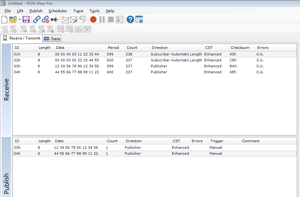 根据集成目标,第5章一共配置了4个报文帧,其中2个周期发送报文,2个周期接收报文。