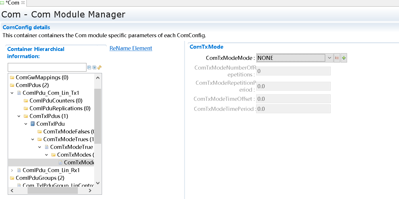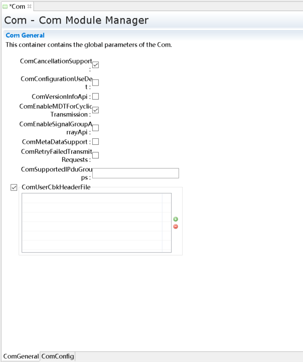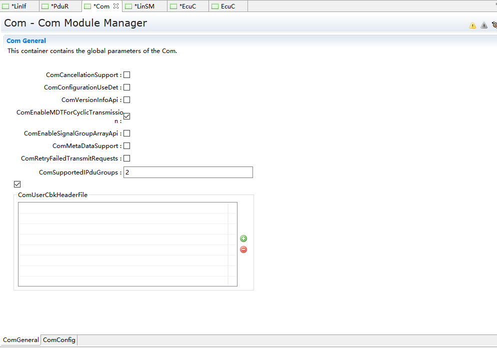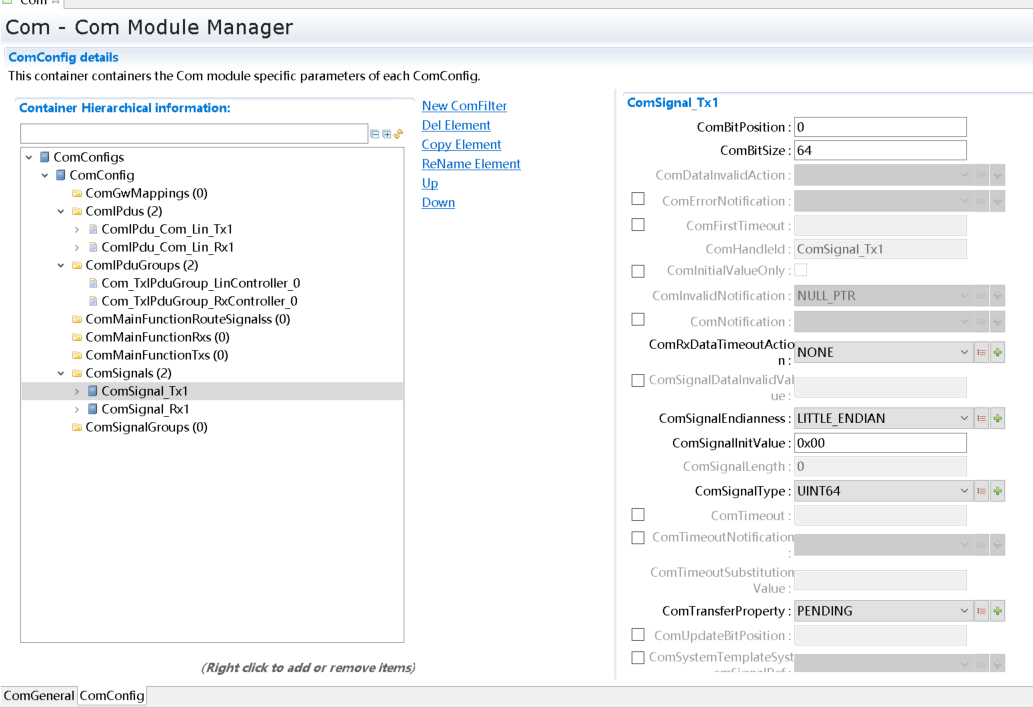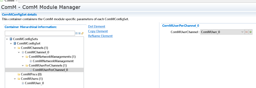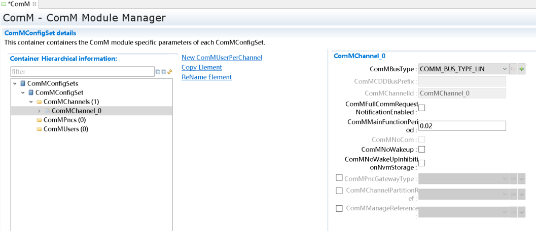 默认已经生成了一个ComMChannel对象ComMChannel_0和一个ComMUser对象ComMUser_0,修改以下几个参数,其余参数保持默认值。