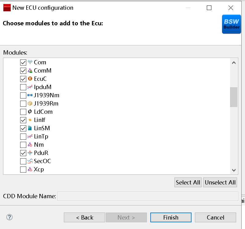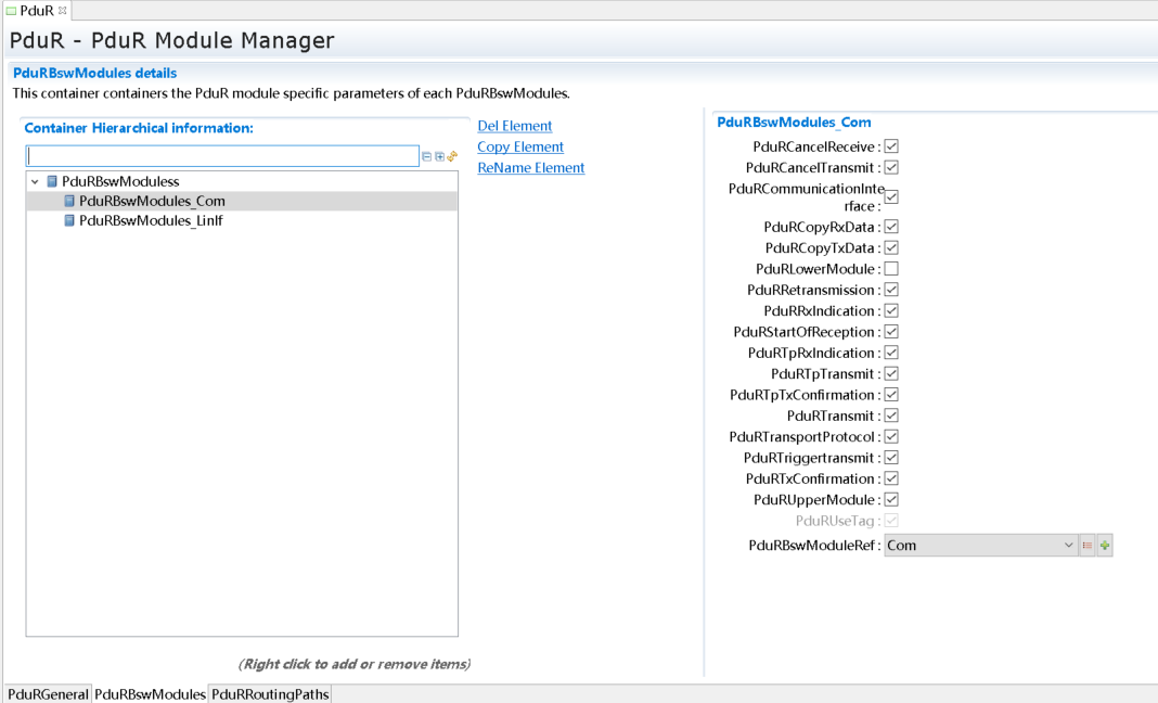 PduR模块的目的是实现上层模块到下层模块的路由。PduRBswModuler对象用来描述上层模块和下层模块属性。本示例中上层模块为Com,下层模块为LinIf,PduR模块将Com中的Pdu路由到LinIf中。所以需要新建2个PduRBswModuler对象,分别对应Com和LinIf。