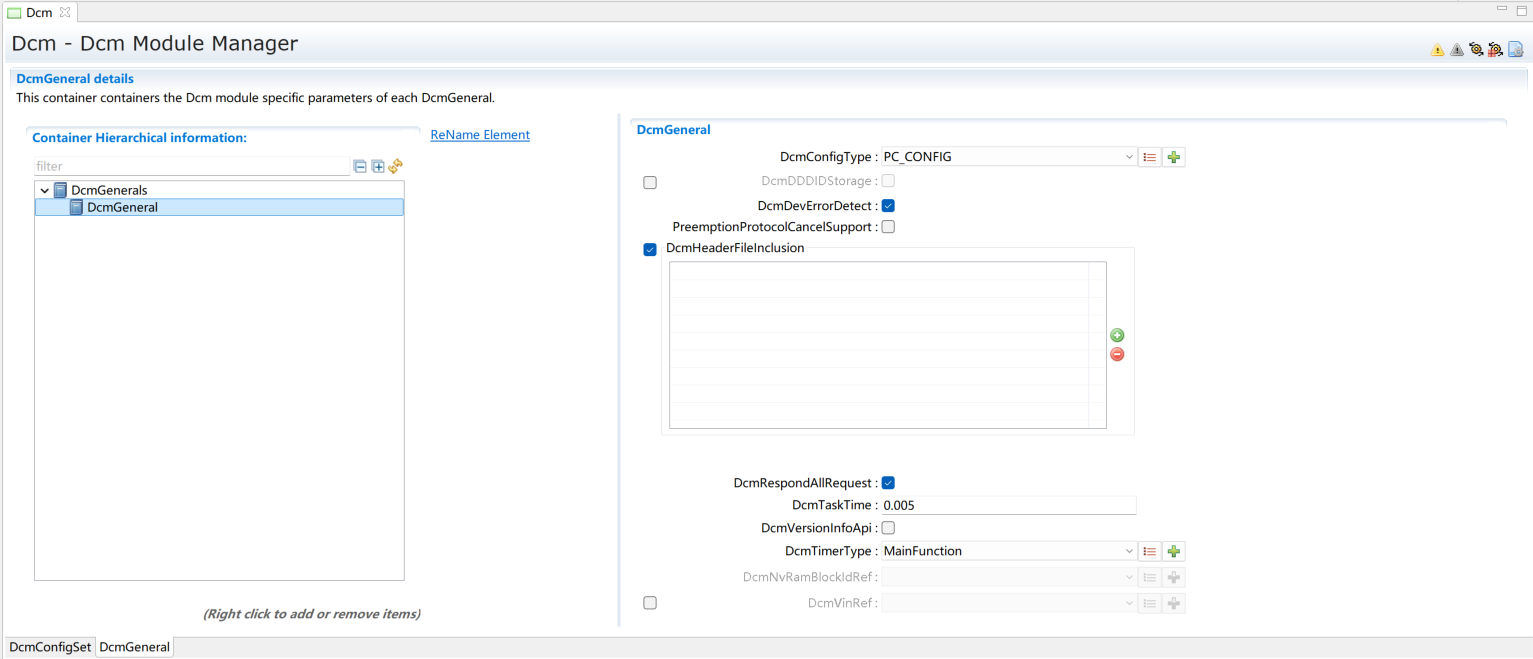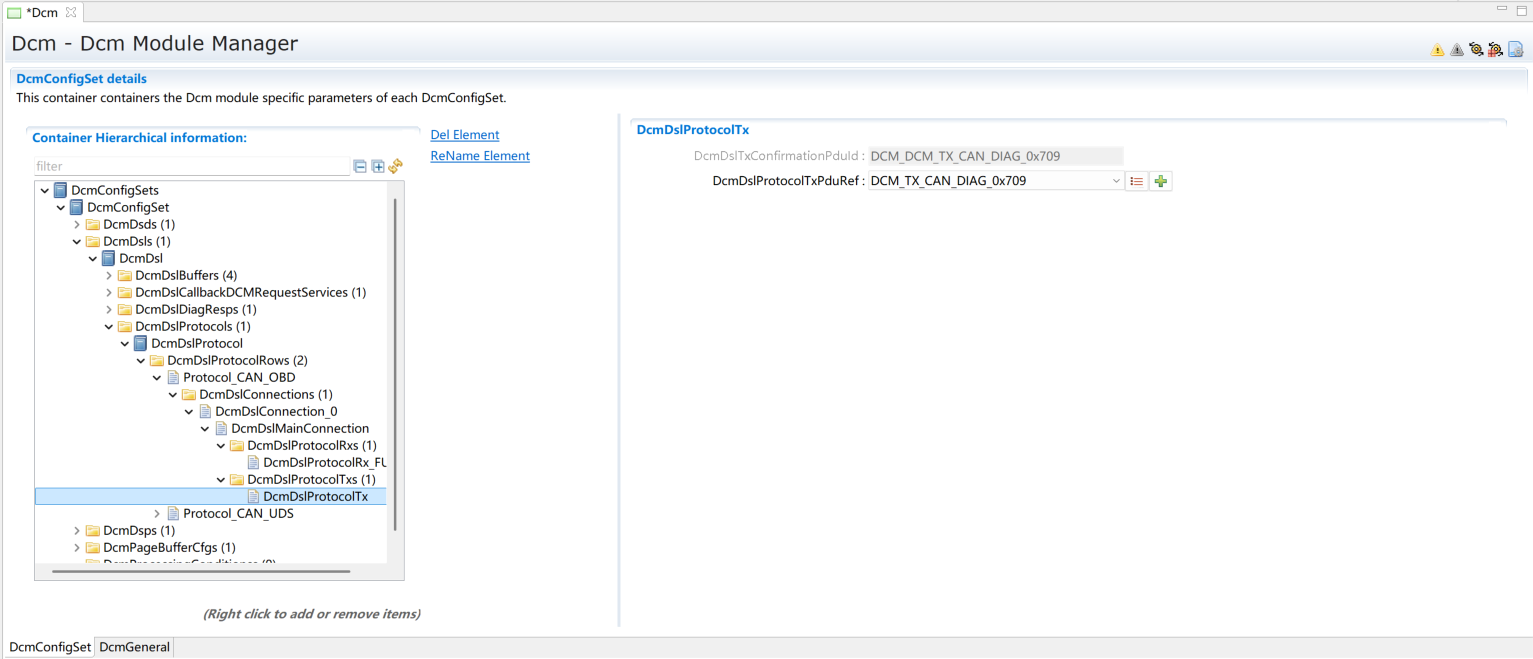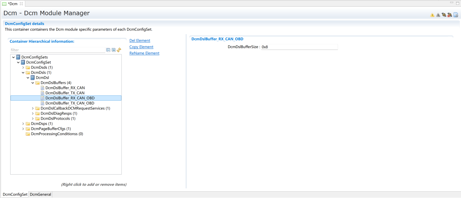 DcmDslBuffer中配置两个buffer分别用于发送和接收,配置Dcm Tx、RxBuffer及其length,需要与EcuC中Dcm对应的Pdu Length的值保持一致。