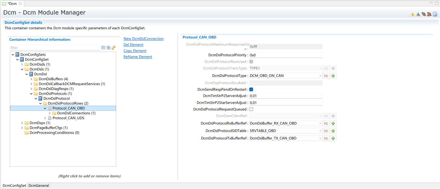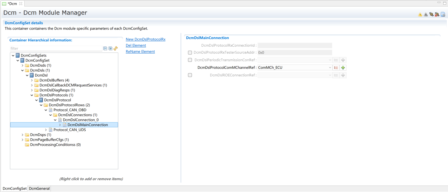 在上步的DcmDslProtocolRow_OBD中新建配置DcmDslMainConnection,选择Dcm通信的ComMChannel,并新建1个DcmDslProtocolRx,1个DcmDslProtocolTx。
