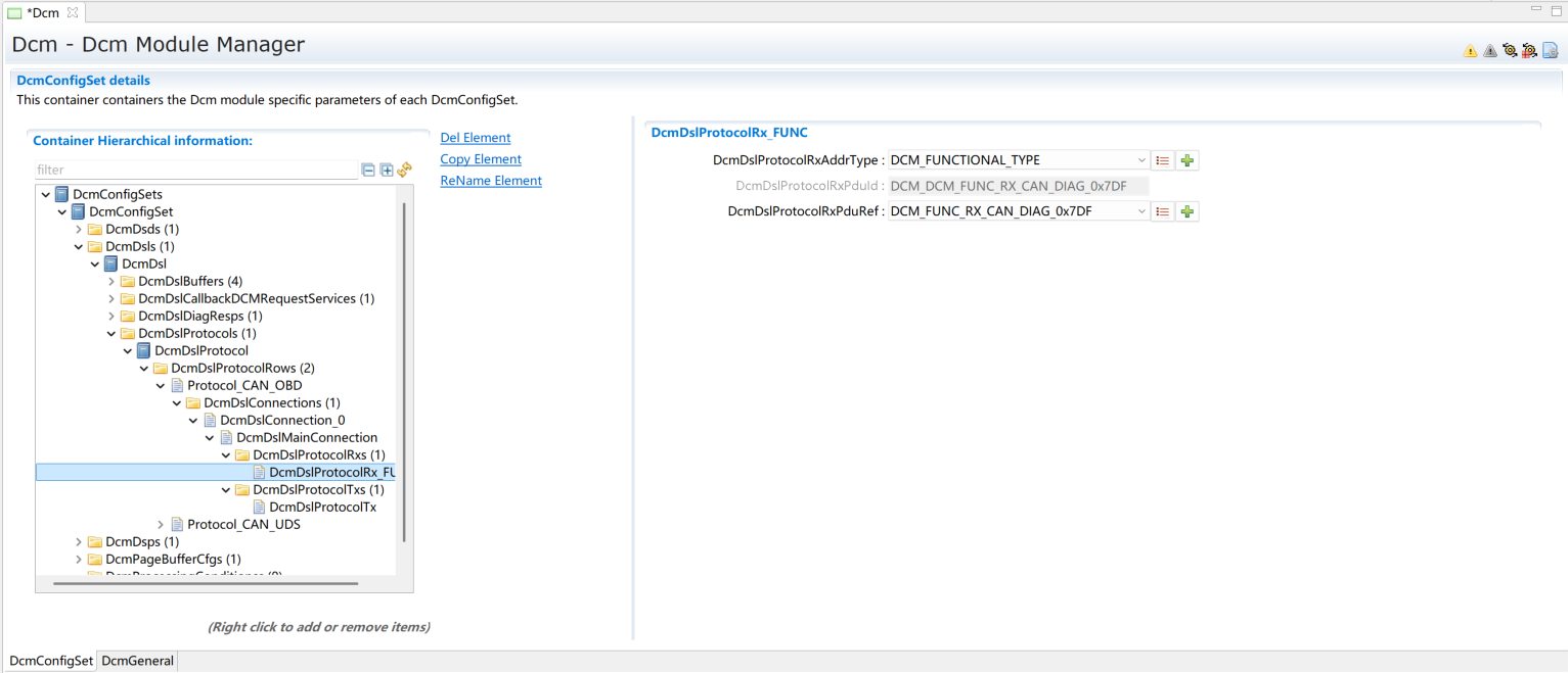 为每个DcmDslProtocolRx、DcmDslProtocolTx添加Dcm对应的PDU及寻址类型。