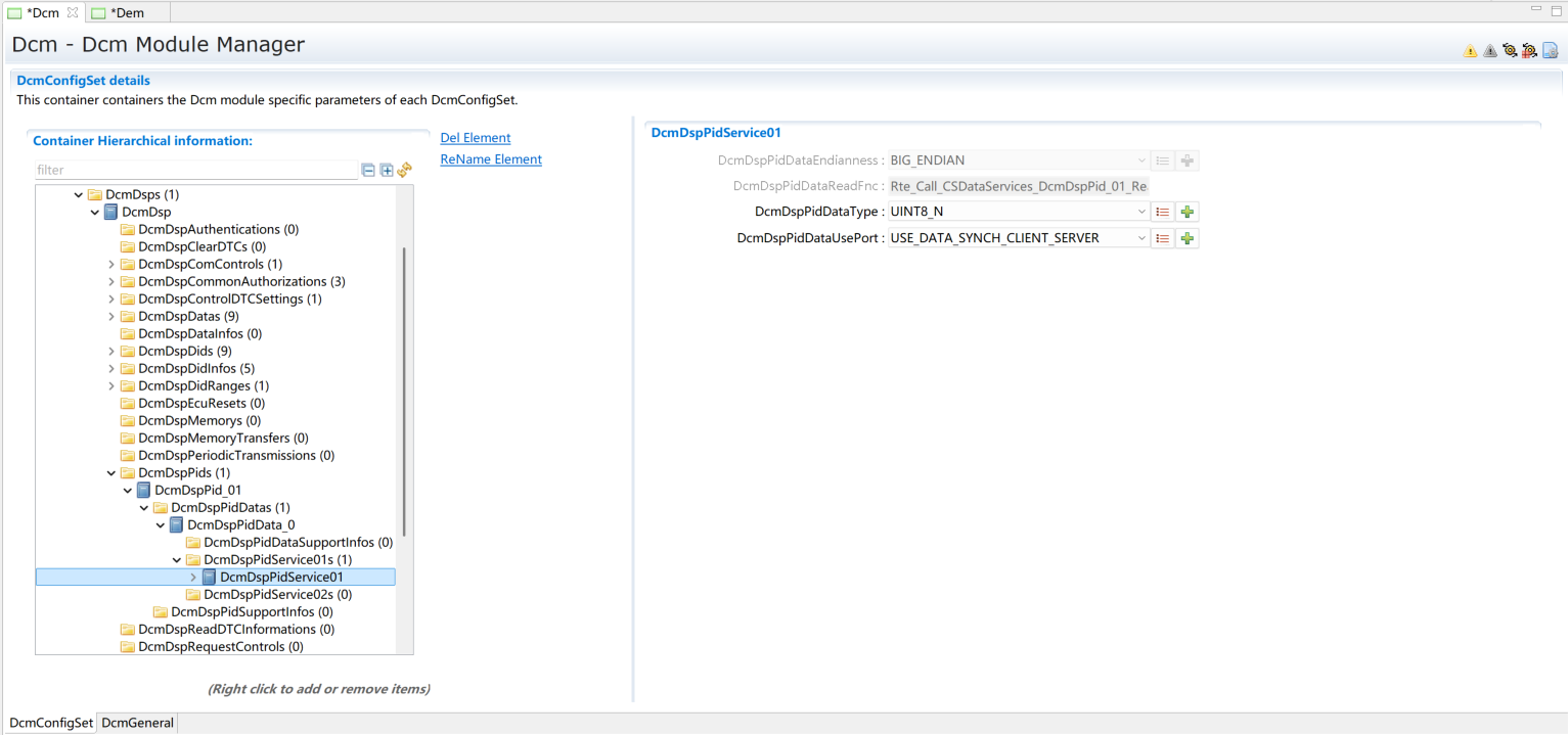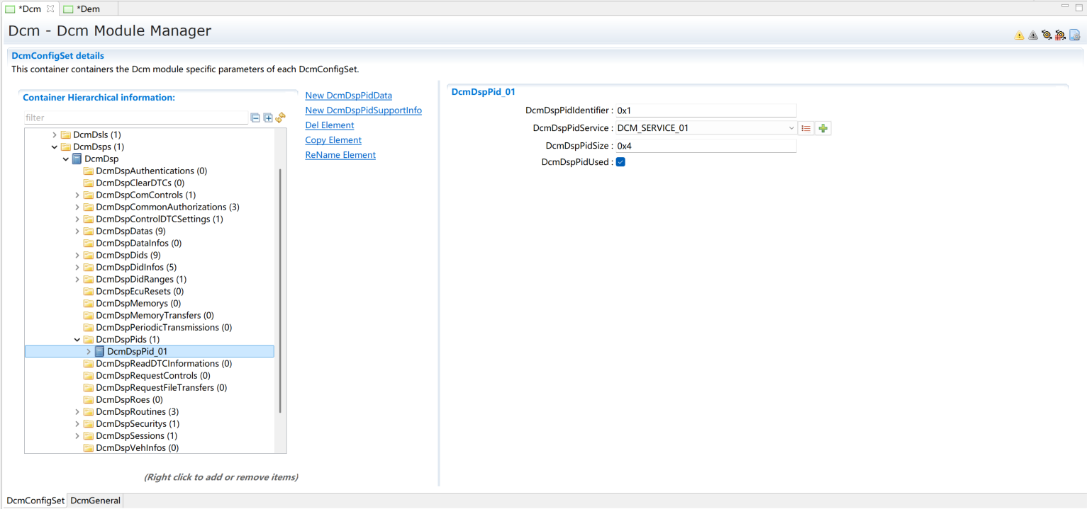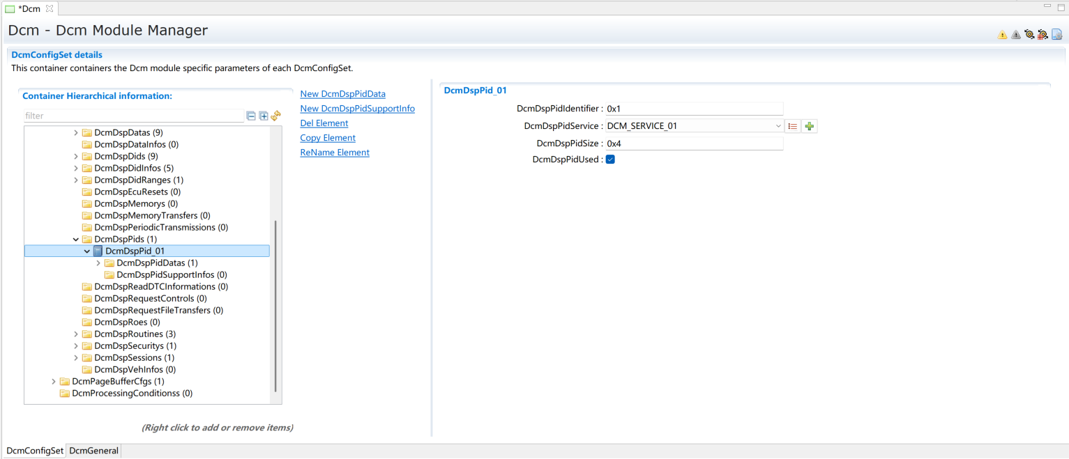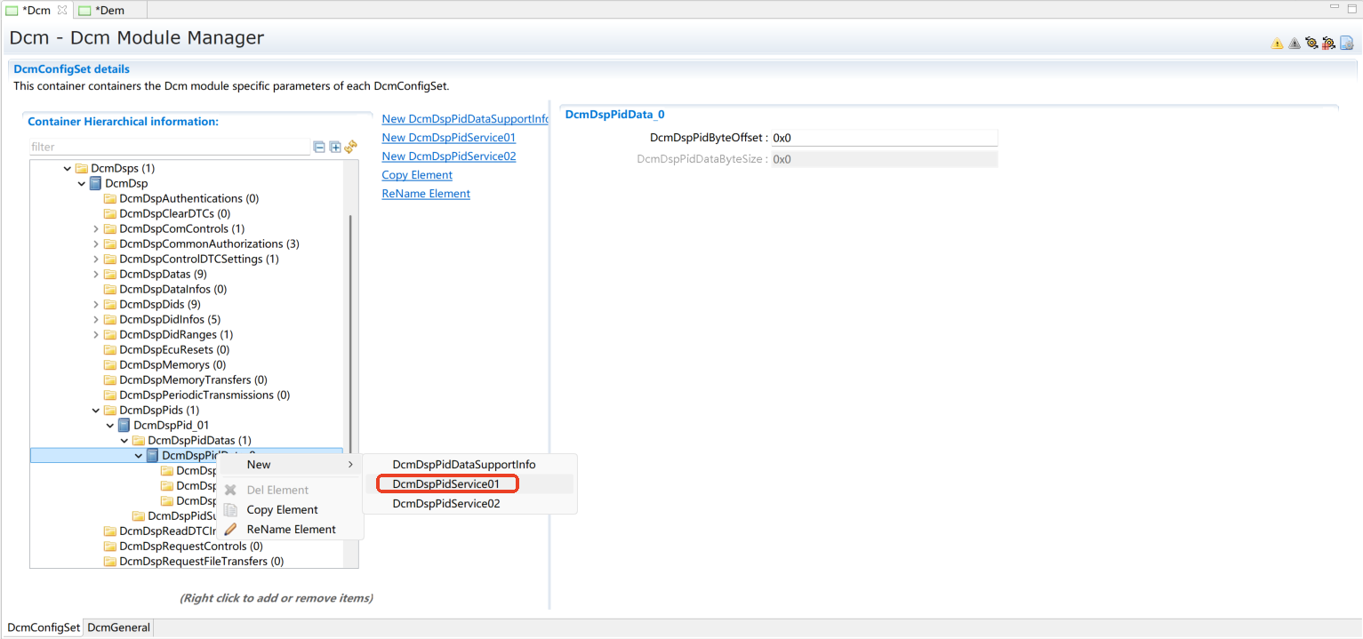 添加一个DcmDspPid。选择服务后暂不修改其它内容,内容修改将在章节(Service 0x01)进行。