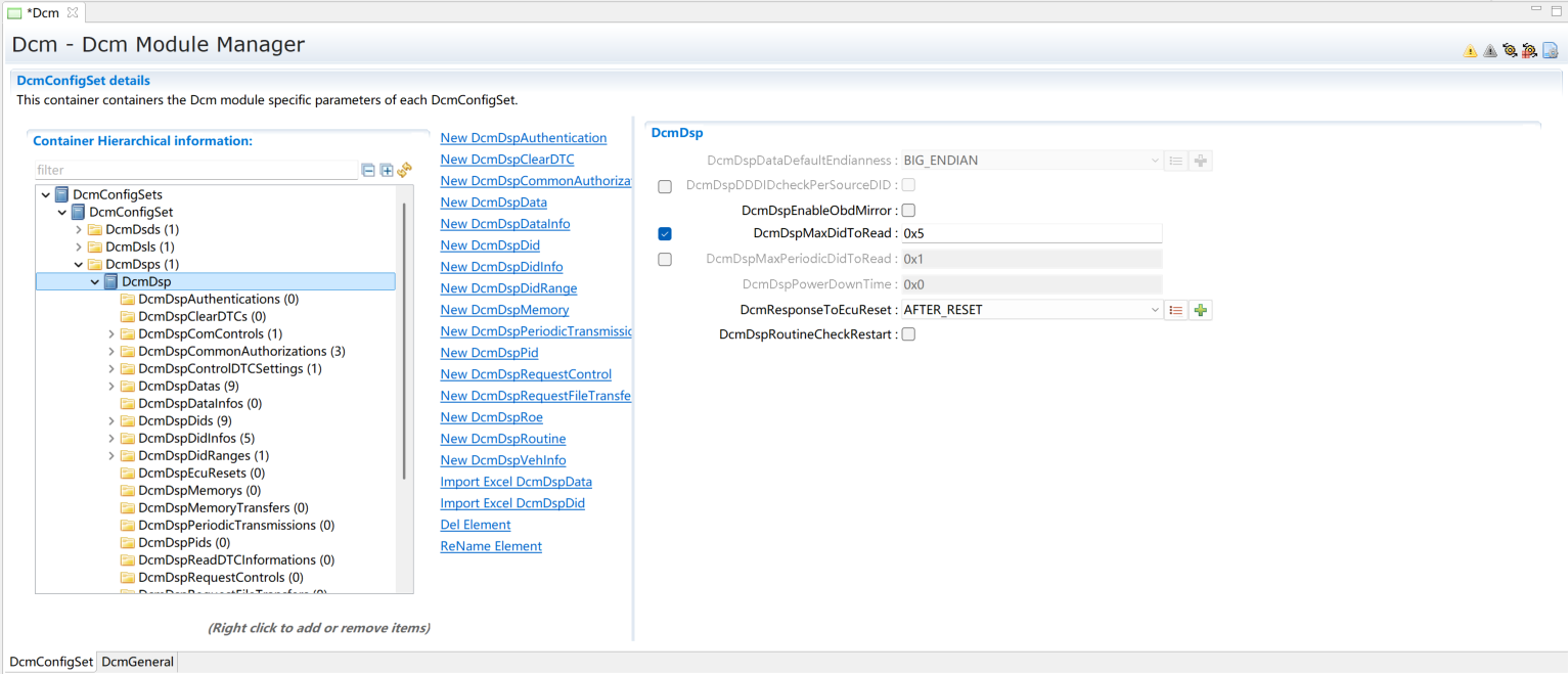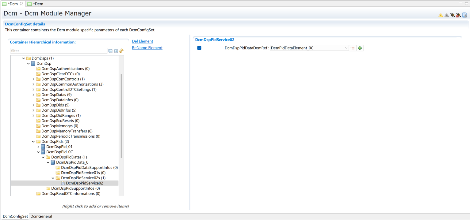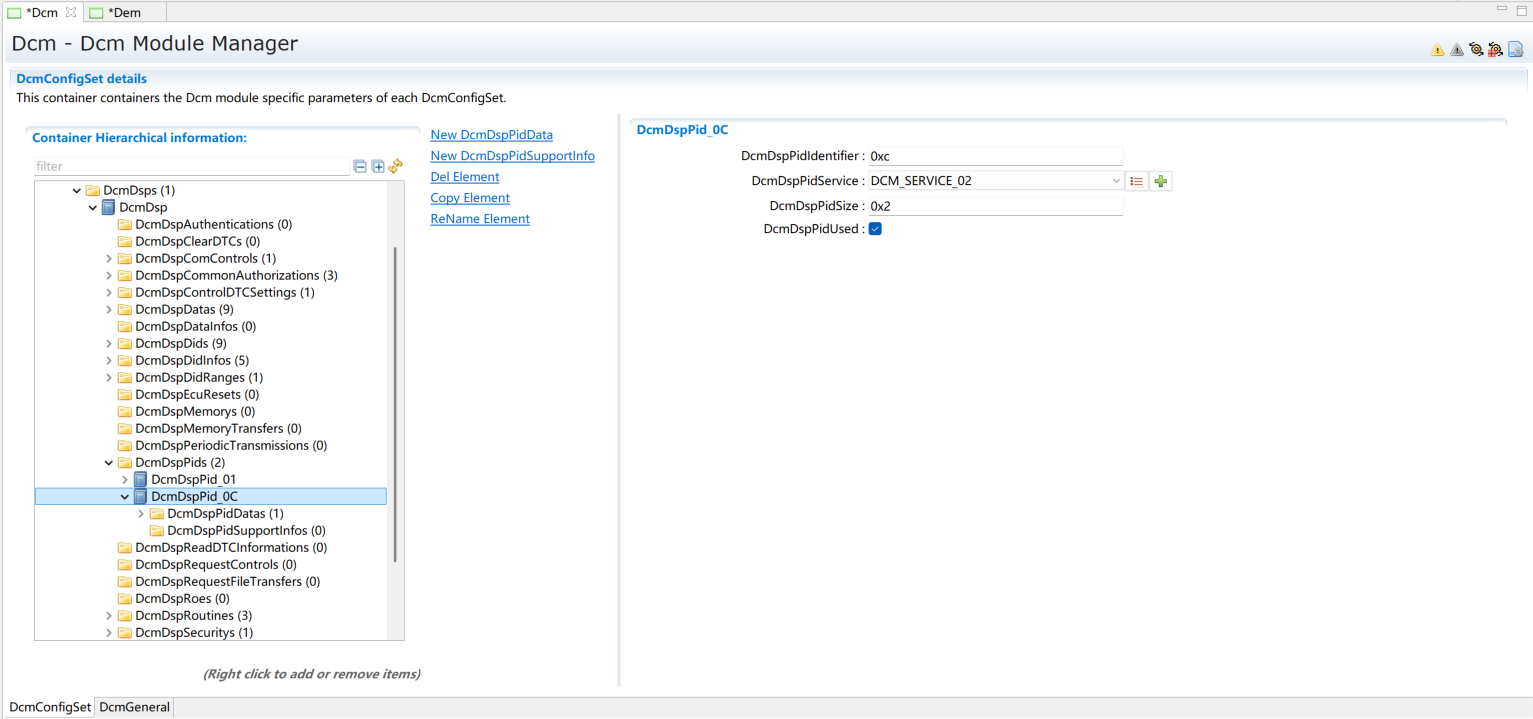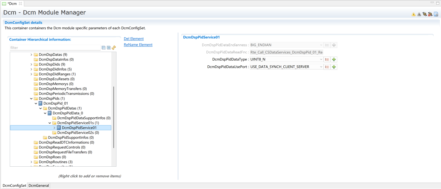 添加一个DcmDspPid。选择服务后暂不修改其它内容,内容修改将在章节(Service 0x01)进行。