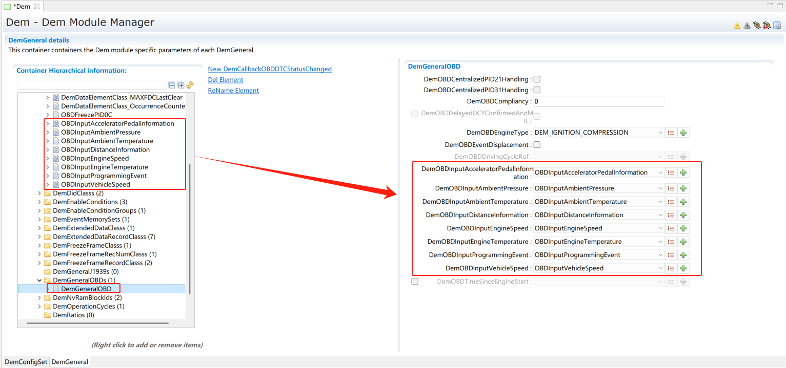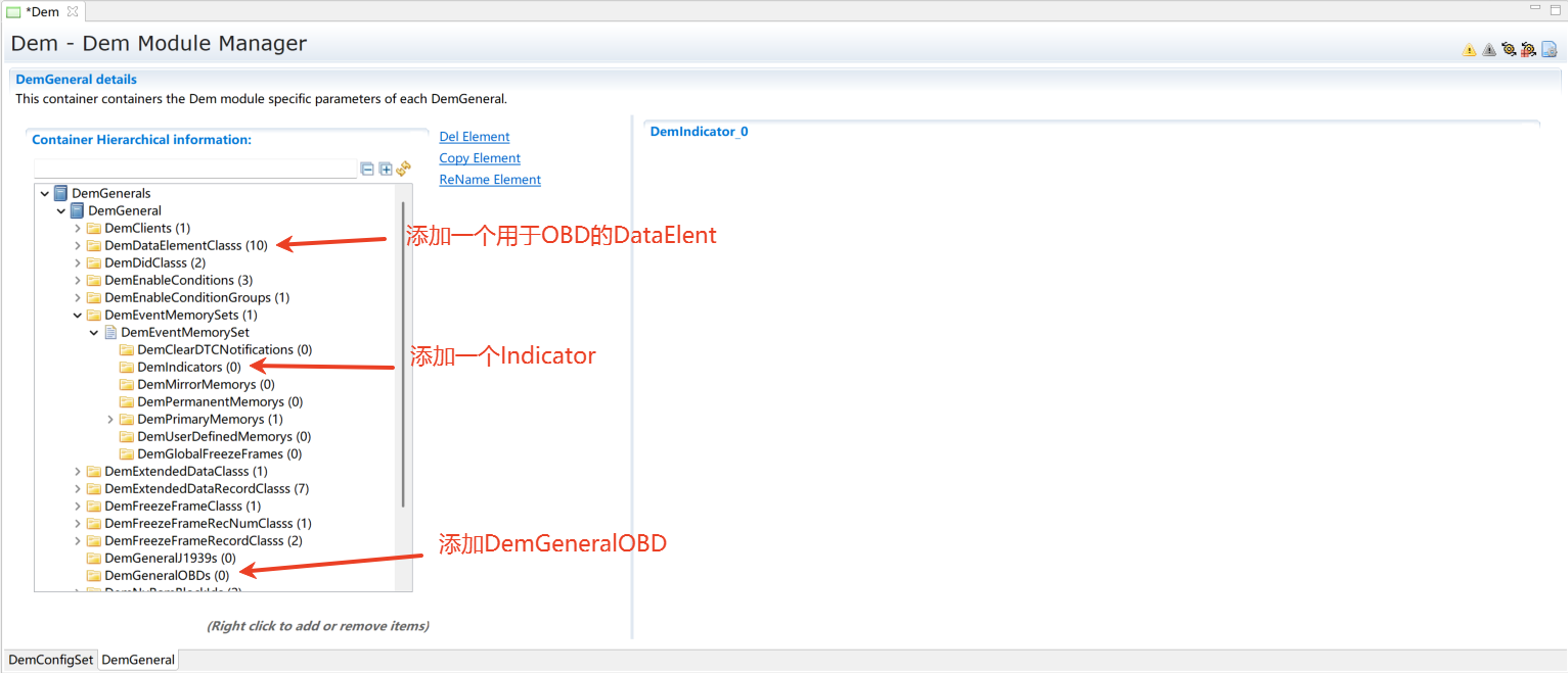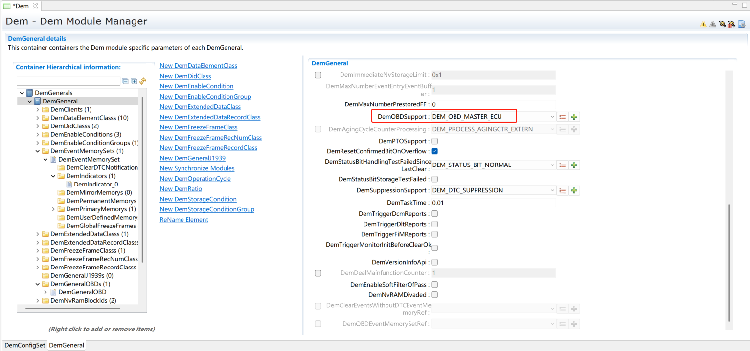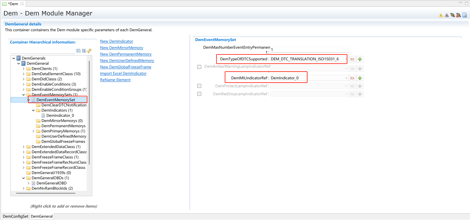 在DemGeneral->DemOBDSupport配置为DEM_OBD_MASTER。同时DemGeneral->DemEventMemorySet->DemMILIndicatorRef关联一个DemIndicator。