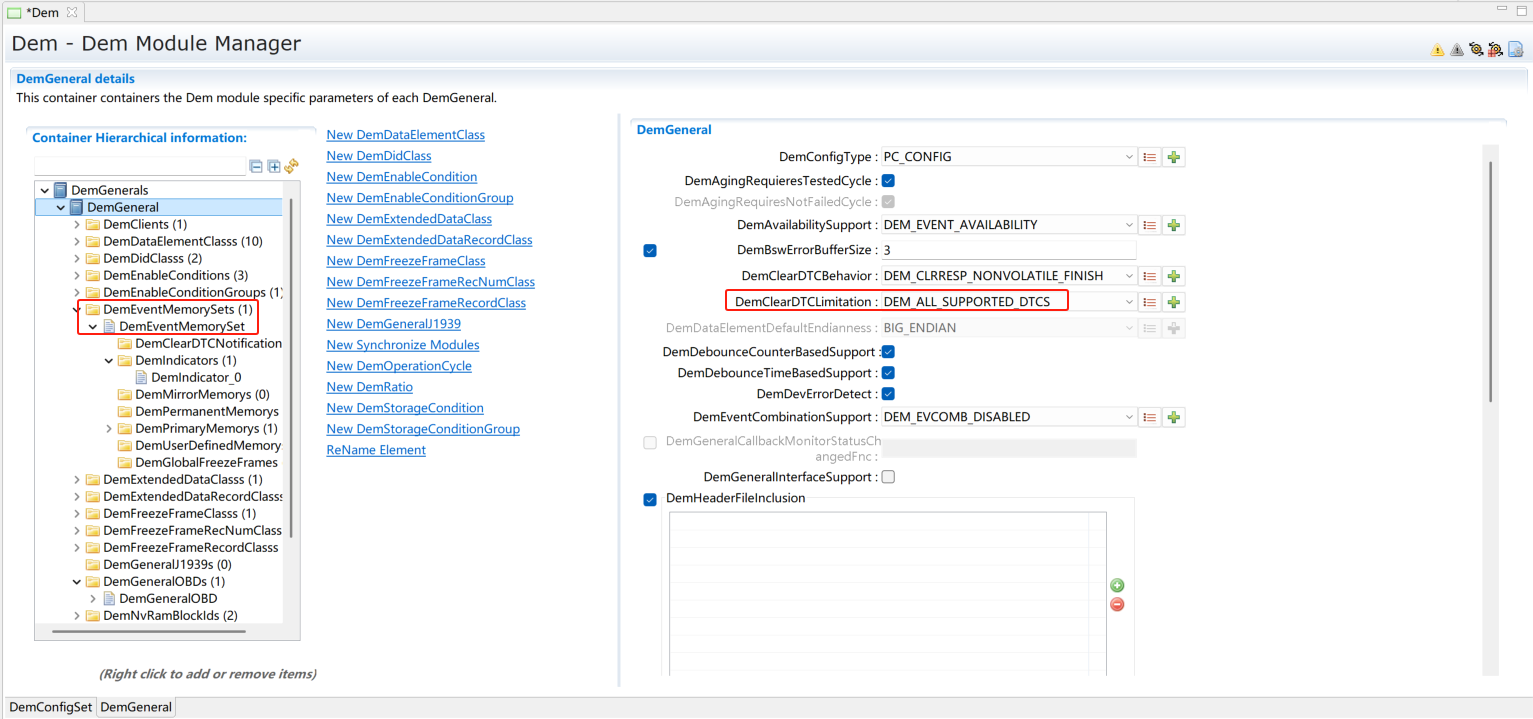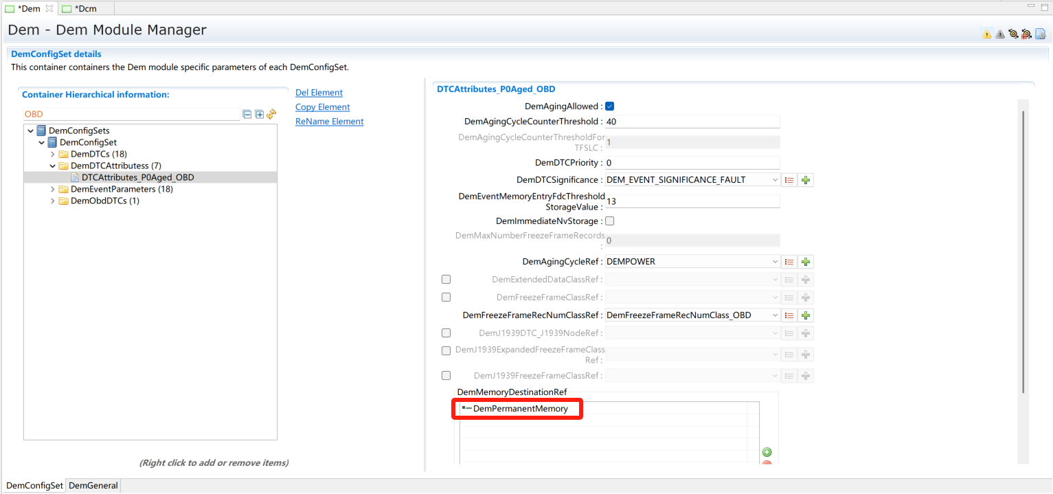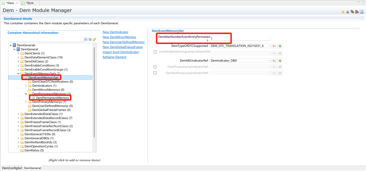 (0x0A服务选用)在DemGeneral中DemEventMemorySet下DemPermanentMemorys添加DemPermanentMemory用于0x0A服务。根据需求将DemGeneral中DemEventMemorySet的DemMaxNumberEventEntryPermanent配置为非0值。