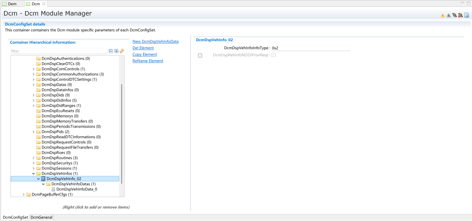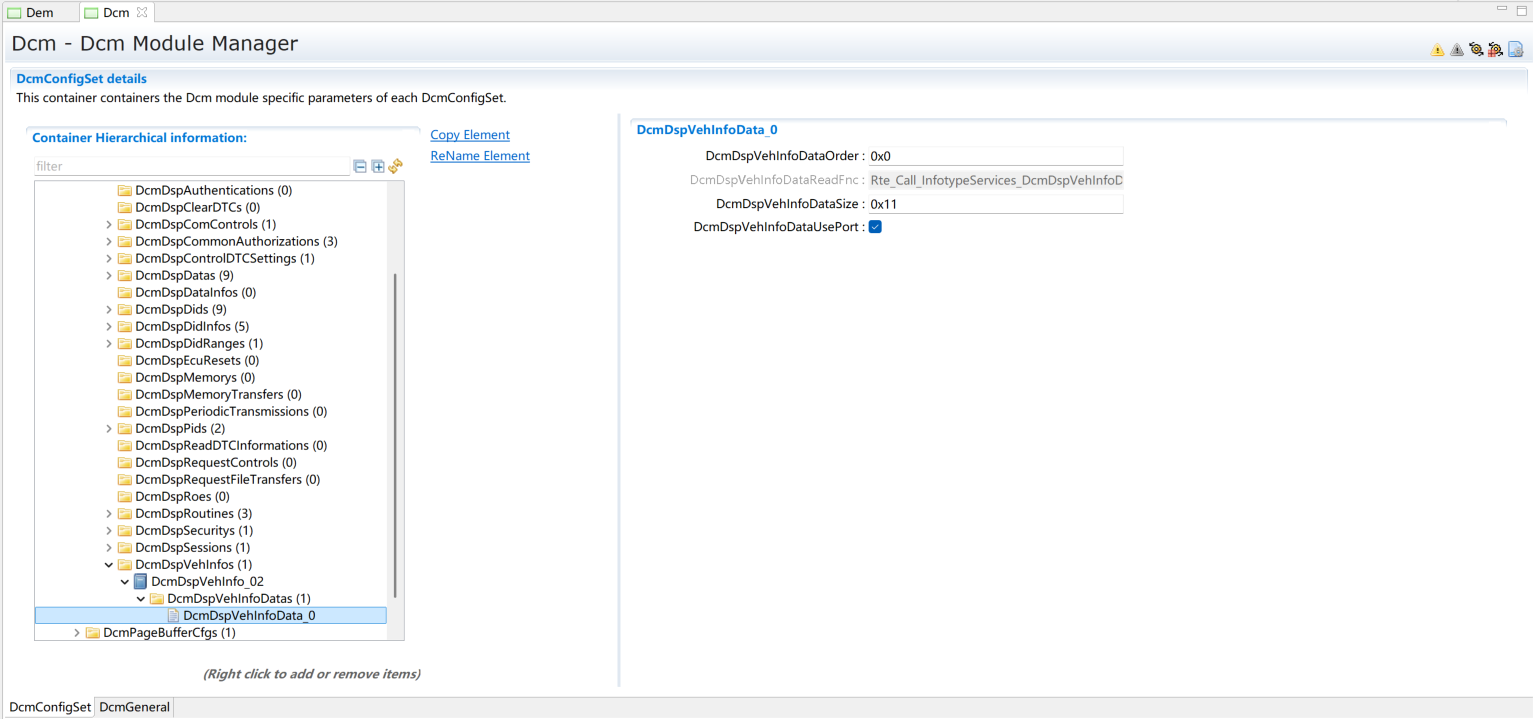 在DcmDspVehInfo中添加DcmDspVehInfoData,配置获取Vehicle information的函数名称 DcmDspVehInfoDataReadFnc或可直接勾选DcmDspVehInfoDataUsePort,并根据需求配置数据的大小DcmDspVehInfoDataSize为17字节。