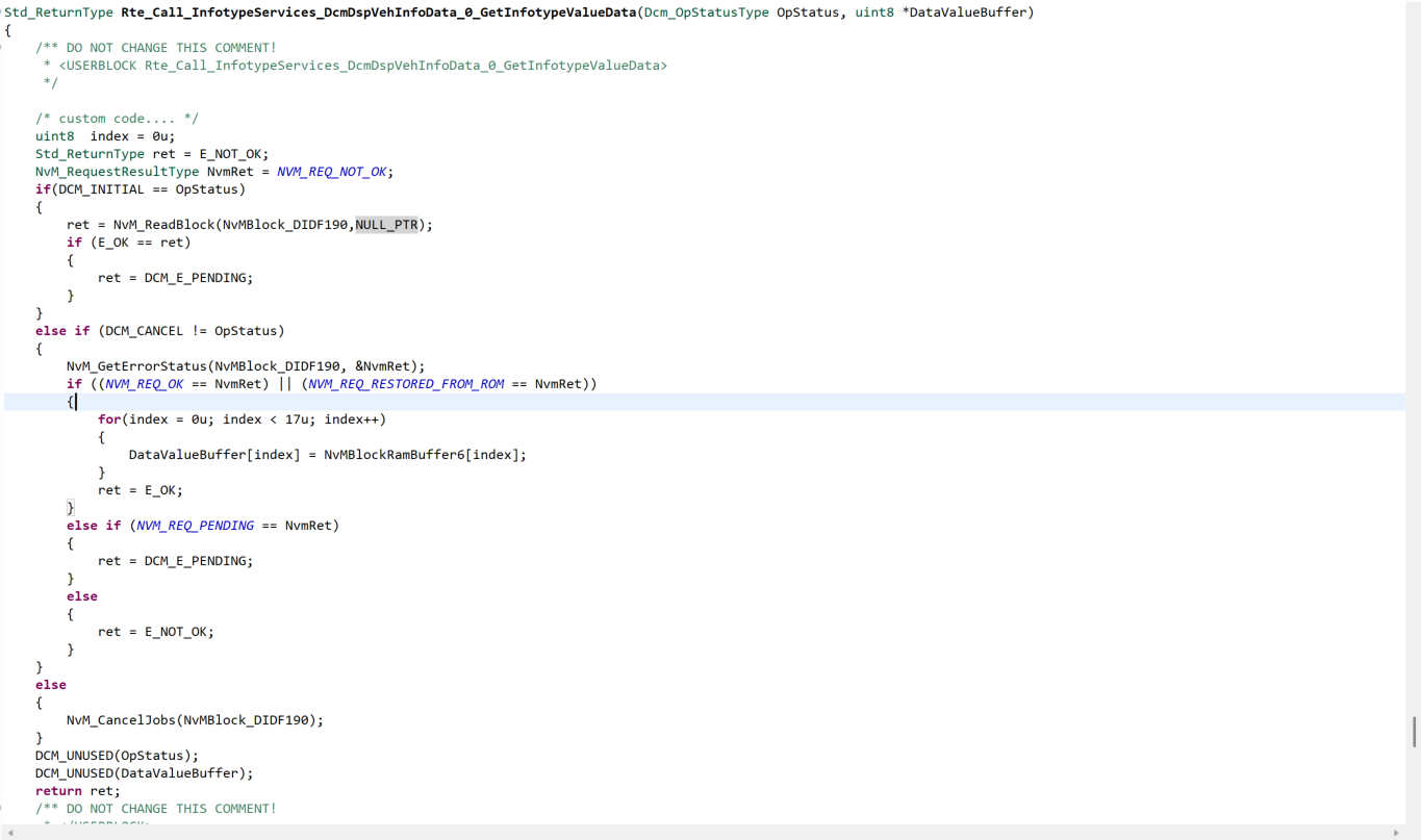 在Rte_Dcm.c中将数据传入 DcmDspVehInfoDataReadFnc配置的函数.