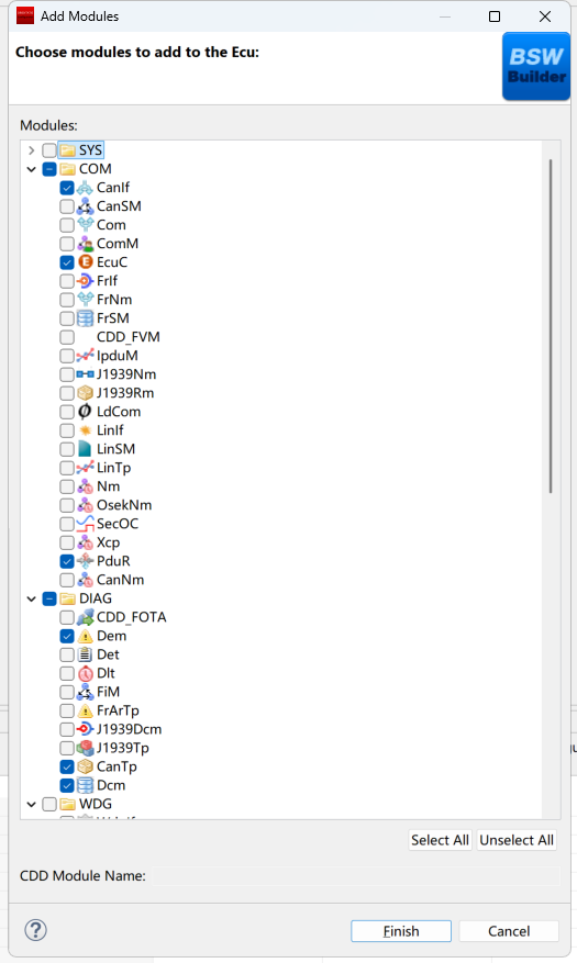 在弹出的窗口中勾选需添加的模块,点击Finish。