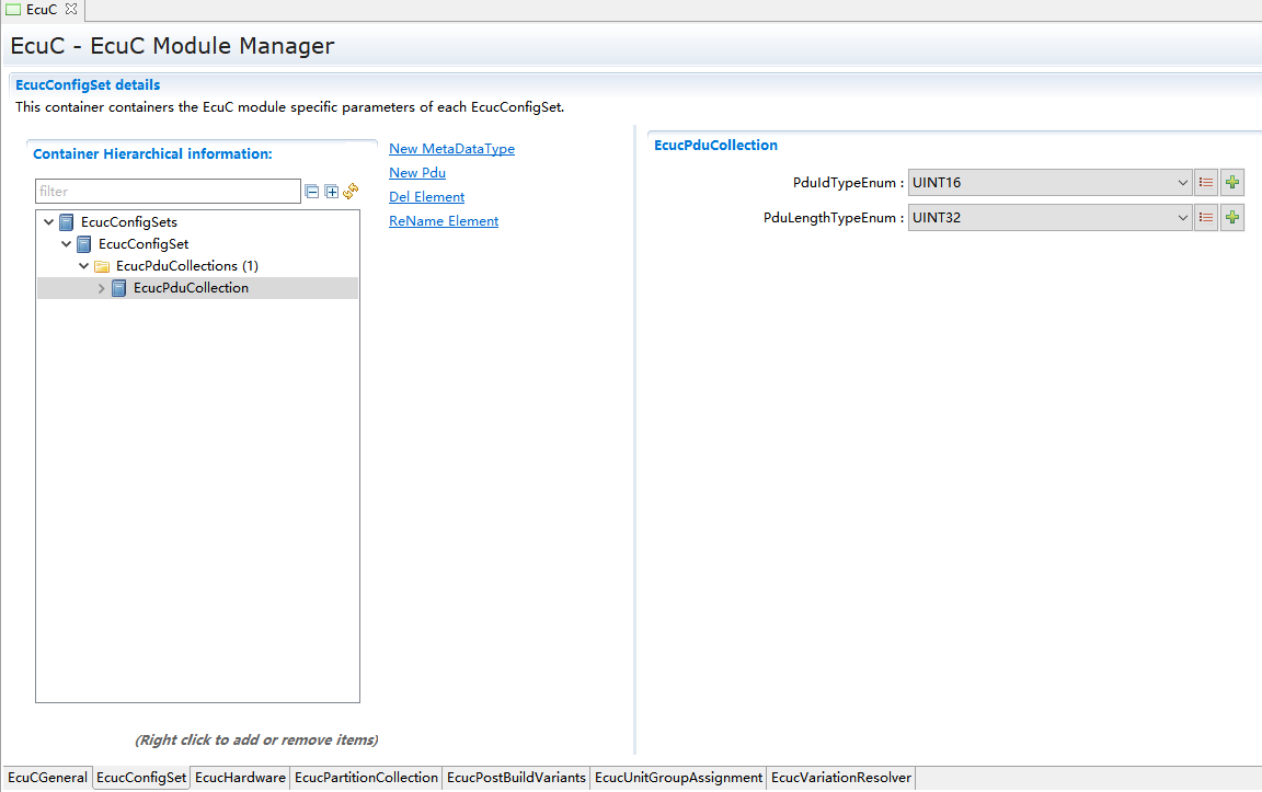 再在EcucPduCollections上右键新建EcucPduCollection。配置PduIdTypeEnum为UINT16,PduLengthTypeEnum为UINT32。