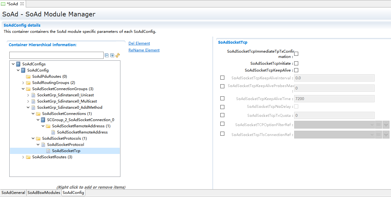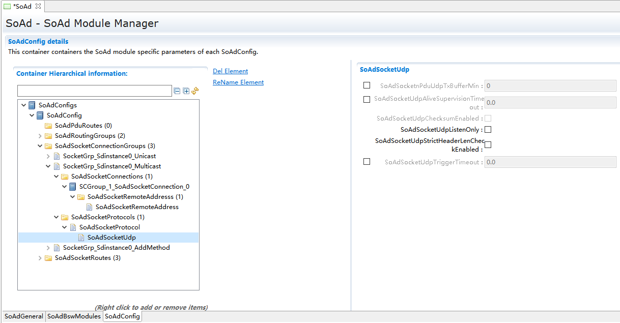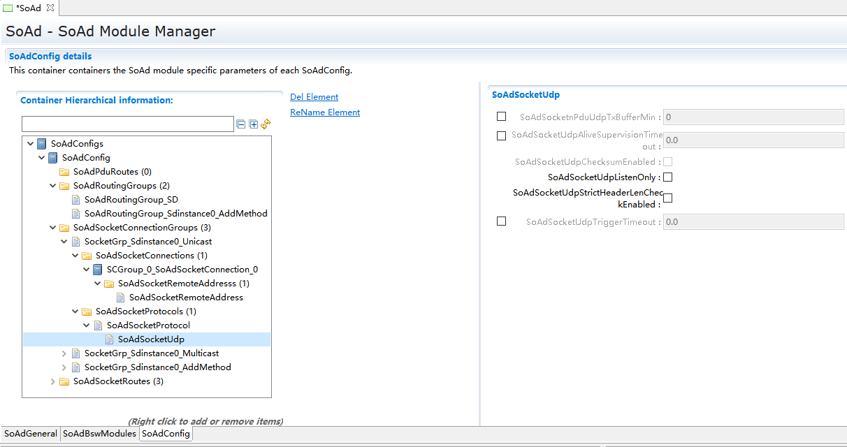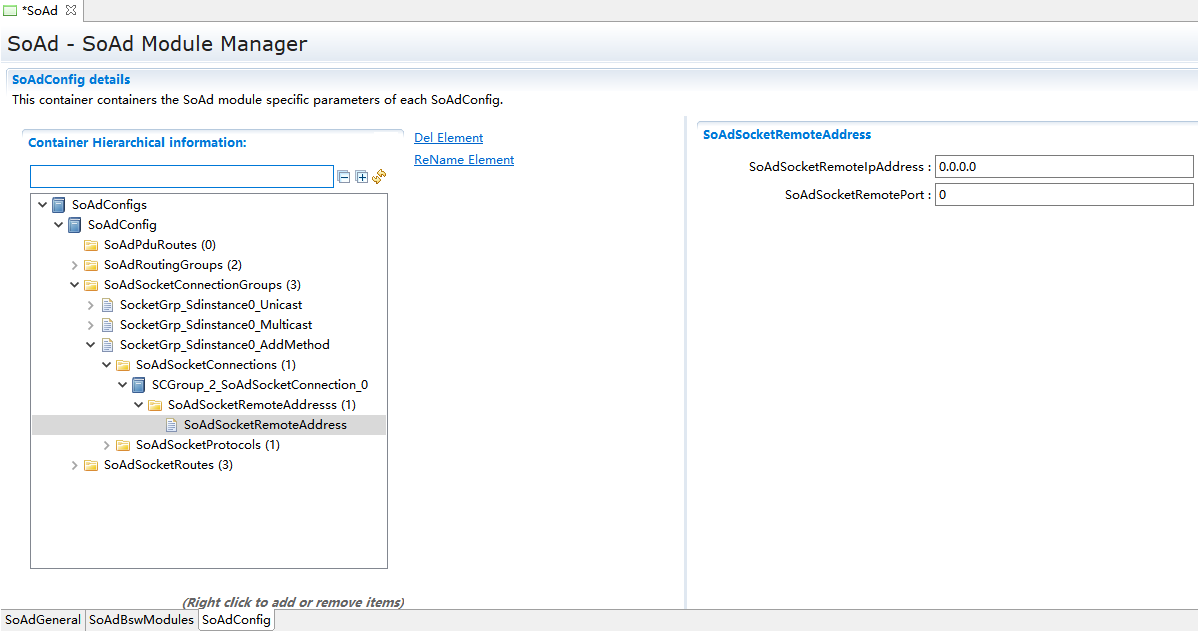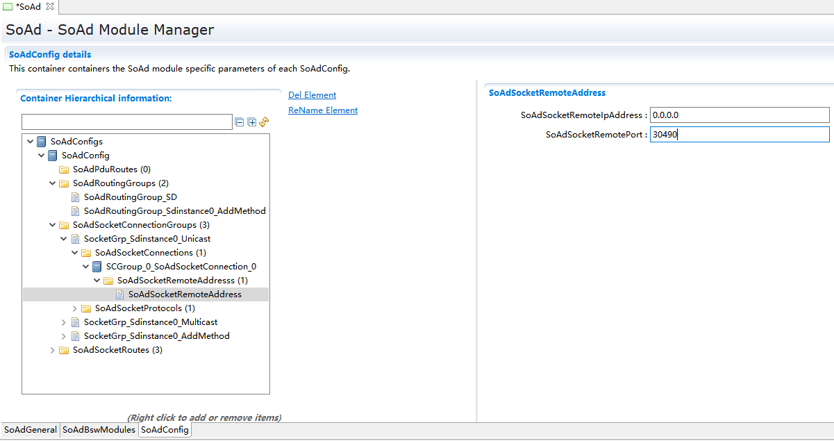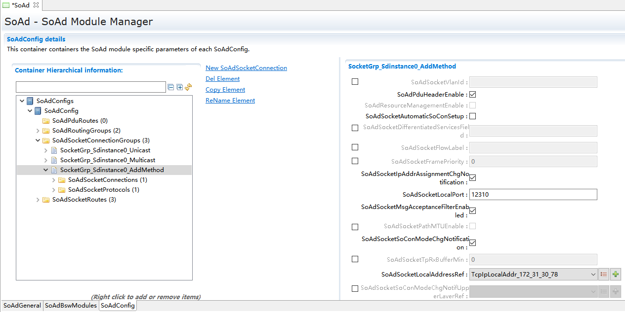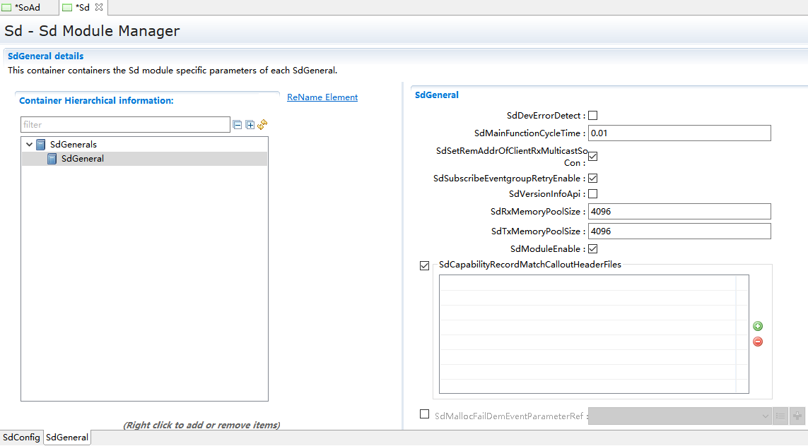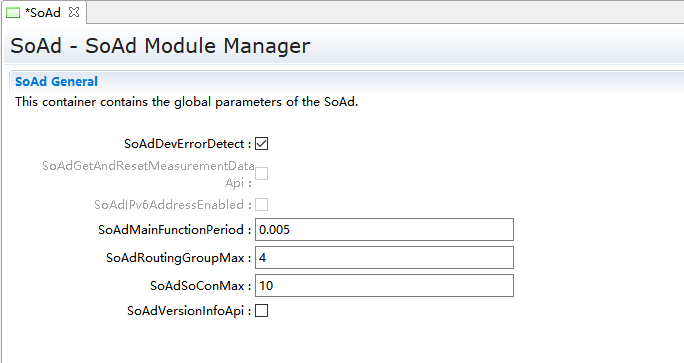 配置SoAdGeneral,配置调度周期0.005S,Socket最大个数4和SocketGroup的最大个数10。