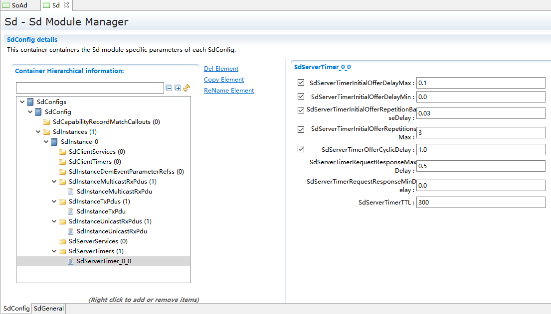 SdServerTimerInitialOfferDelayMax:0.1 SdServerTimerInitialOfferDelayMin:0.0 SdServerTimerInitialOfferRepetitionBaseDelay:0.03 SdServerTimerInitialOfferRepetitionsMax:3 SdServerTimerOfferCyclicDelay:1.0 SdServerTimerRequestResponseMaxDelay:0.5 SdServerTimerRequestResponseMinDelay:0.0 SdServerTimerTTL:300 |