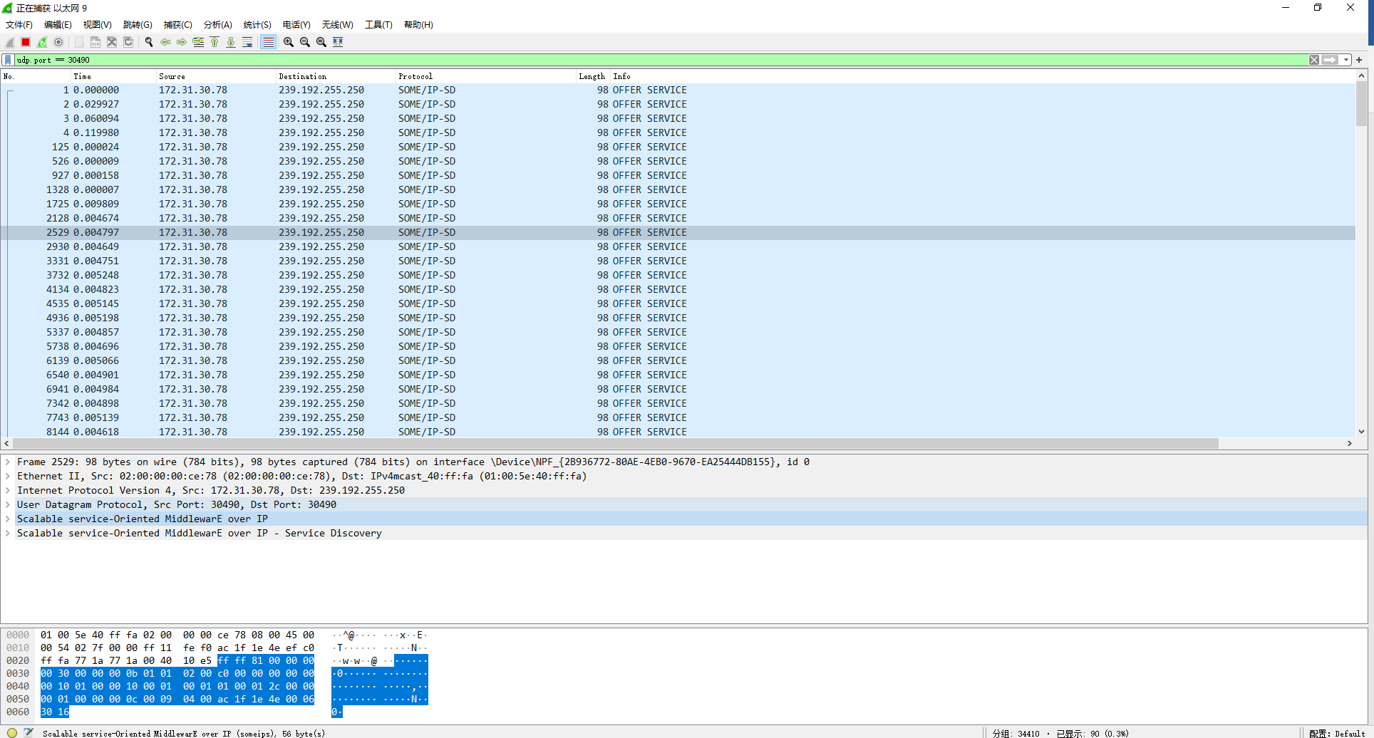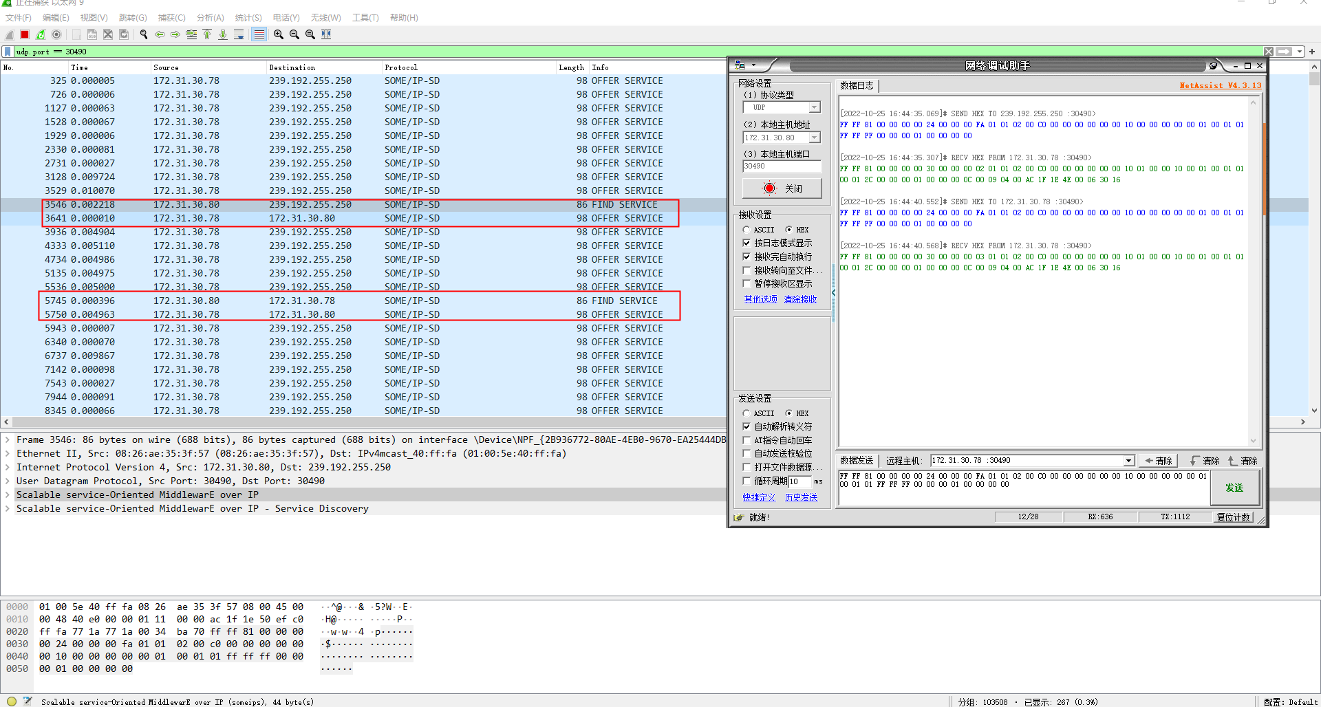 使用wireshark监控Offer Service正常多播发送,符合集成目标。