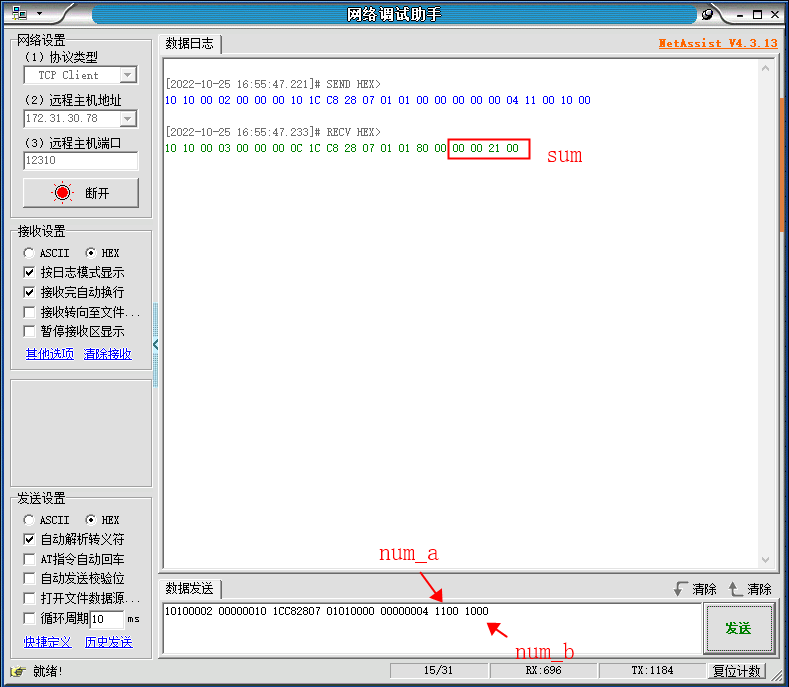 #. 使用调试助手,连接AddMthod TCPserver,发送加法运算请求报文,控制器返回正确运算结果,符合预期目标。