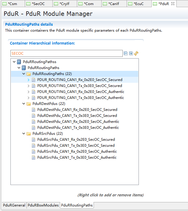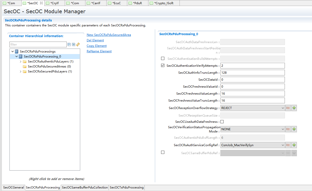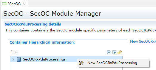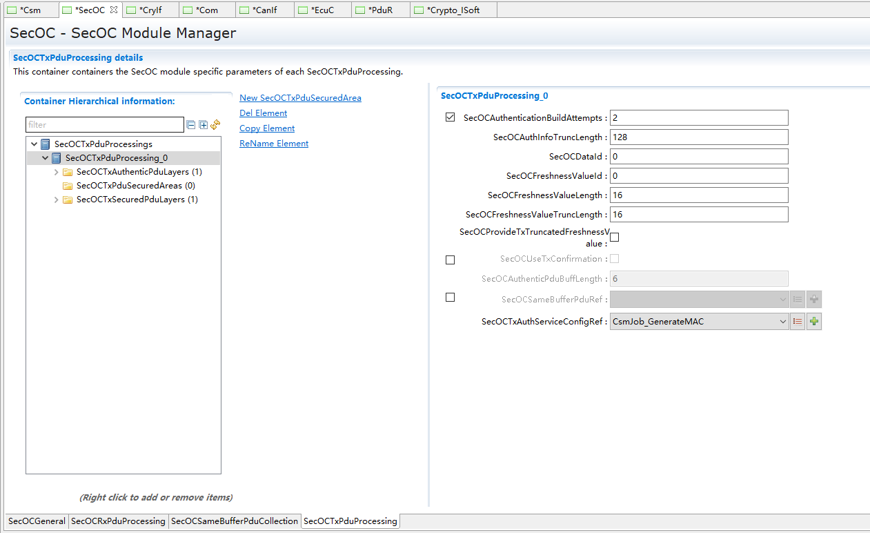 如上图,SecOCTxPduProcessings为SecOCTxPduProcessing对象的集合,在该对象的右键菜单中,可添加0 .. n个SecOCTxPduProcessing对象。