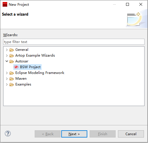 在弹出的新建窗口中选择Autosar下的 [BSW Project],选择Next。