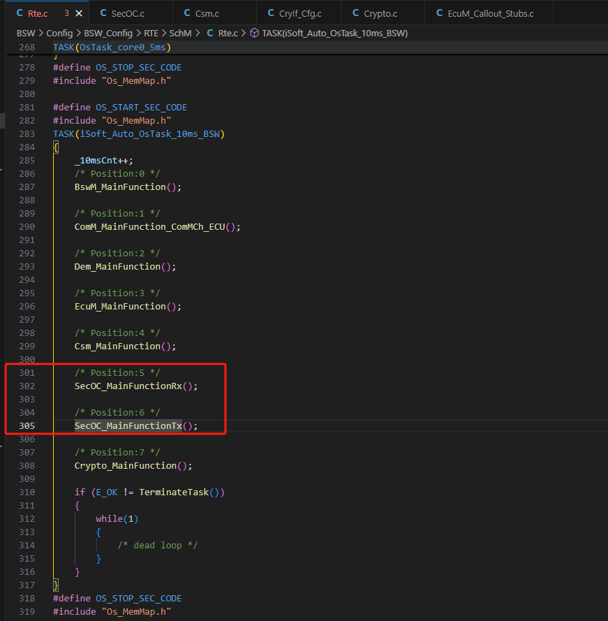 信息的加密和解密是下函数,放置在5ms周期里面,进行周期的处理发送和接收的SecOC报文。