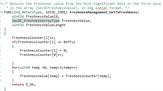 需要在Rte_SecOC.c的函数FreshnessManagement_GetTxFreshness中添加对入参freshnessValue的操作,作为观察周期发送的新鲜度值的依据,以下为一个简单的周期更新计算方法:
