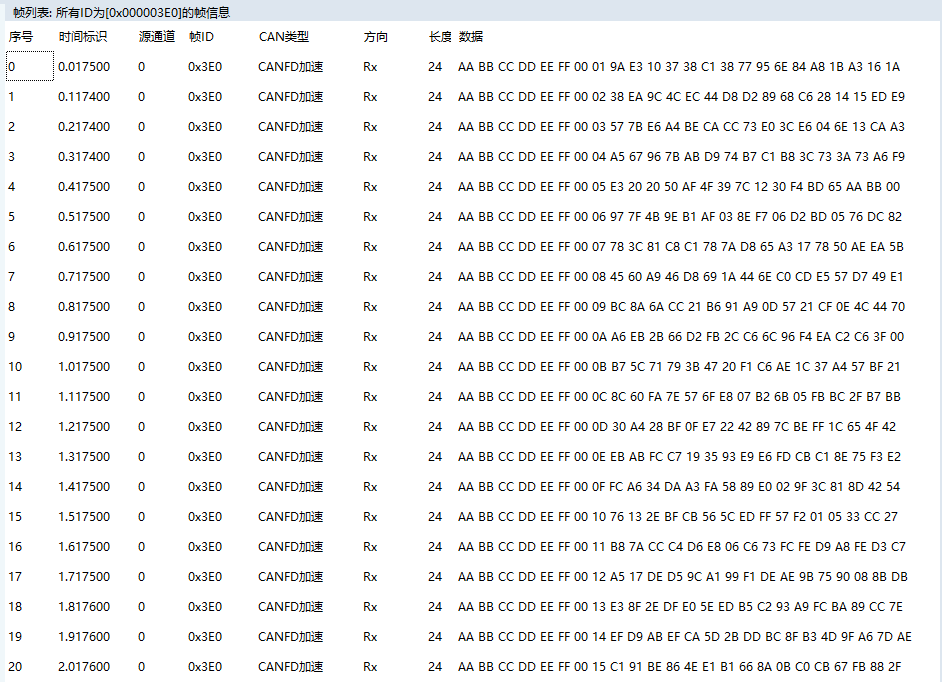 在CAN监测工具里面观察数据新鲜度的变化是否连续。新鲜度在本例程里占2Bytes,在真实数据的后面。