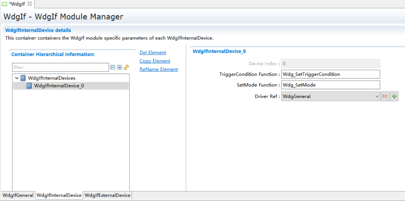 1.允许WdgM访问多个底层Wdg抽象模块。 2.该模块的API都映射到下层Wdg抽象模块的API。 |